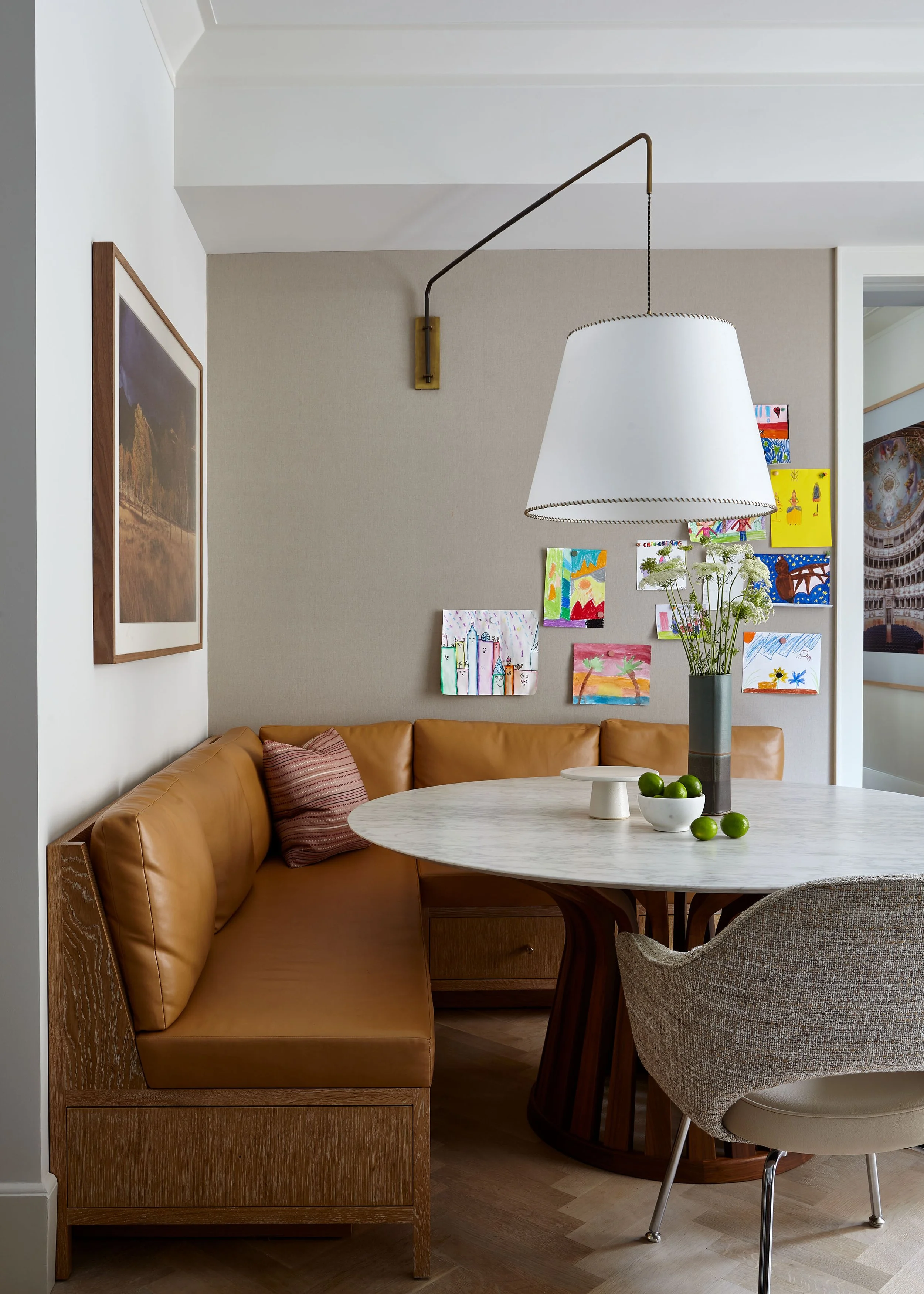 The apartment's previous kitchen was designed without consideration for cooking, so we transformed it into a place where the family could practice their culinary passions. The custom design, painted in Benjamin Moore Backwoods, creates a handsome yet functional space for the family to cook, entertain, and, most importantly, eat.