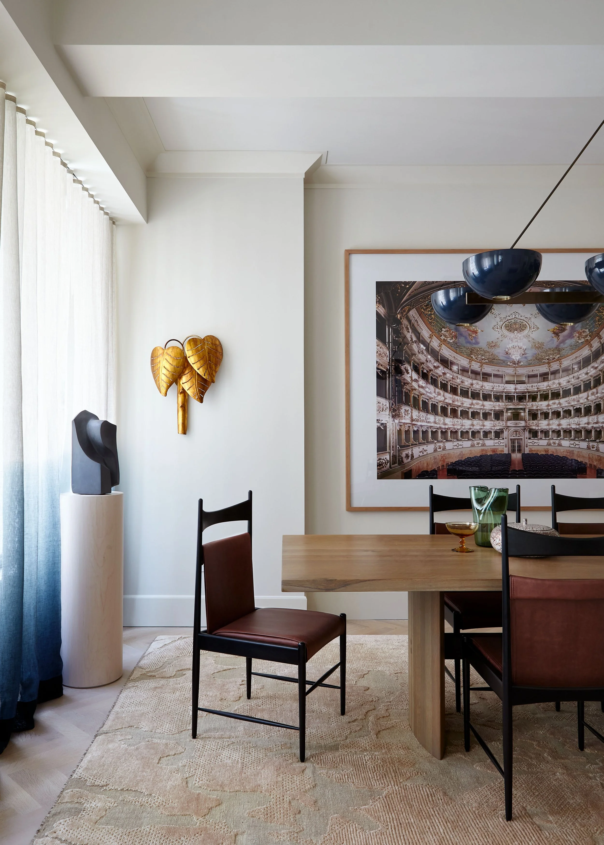 The concrete pillars of the former car park dictated the size and proportions of the rooms, which is especially evident in the expansive living room. On one side, a Kagan-inspired sofa in aubergine wool arcs along a Perriand Rio coffee table. On the other side, an Edward Wormley wing chair sits beside a Karl Springer games table and Gregorius Pineo chairs. On both sides, hang a trio of custom sconces in brass and Murano glass, each slightly different from the other.