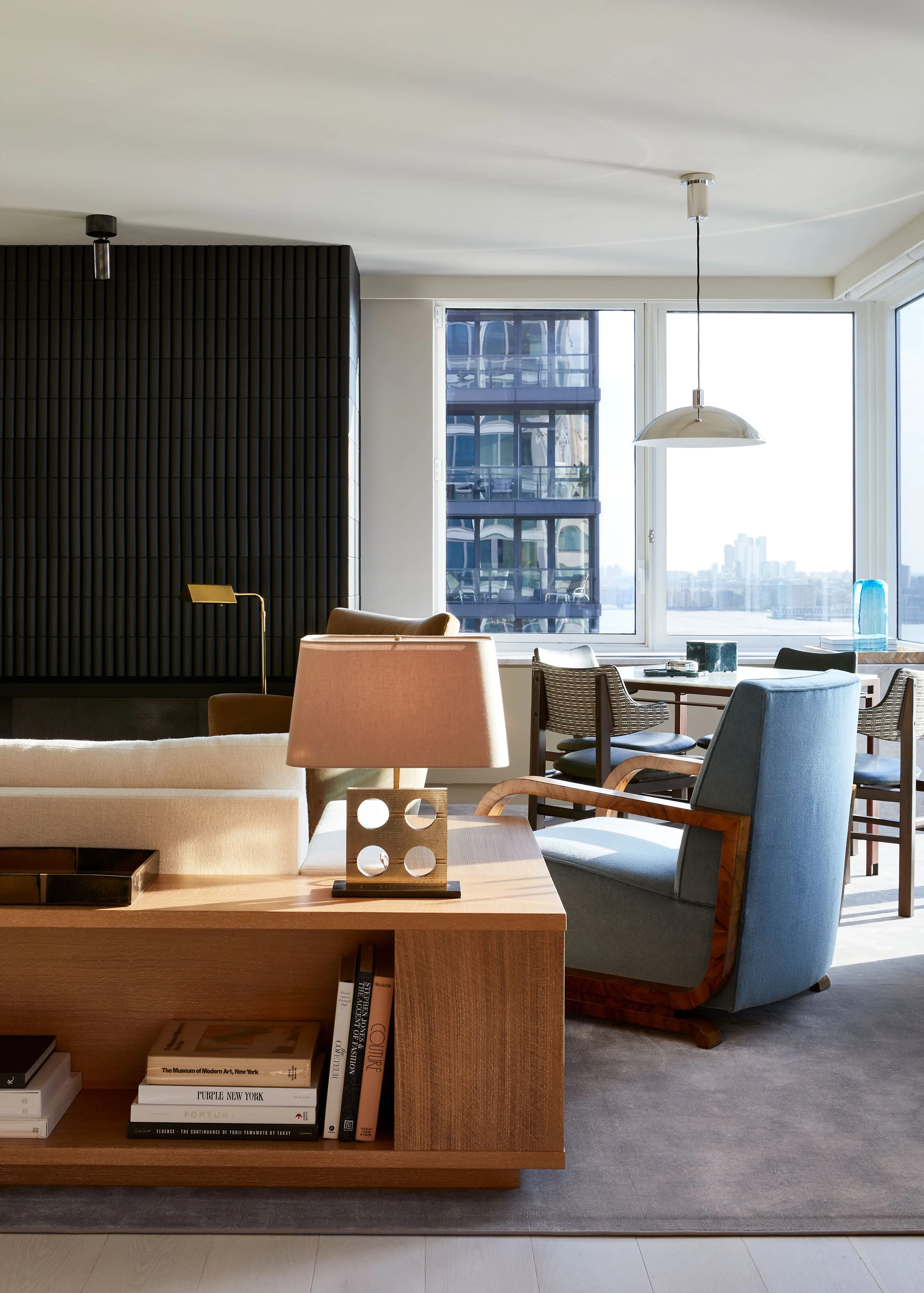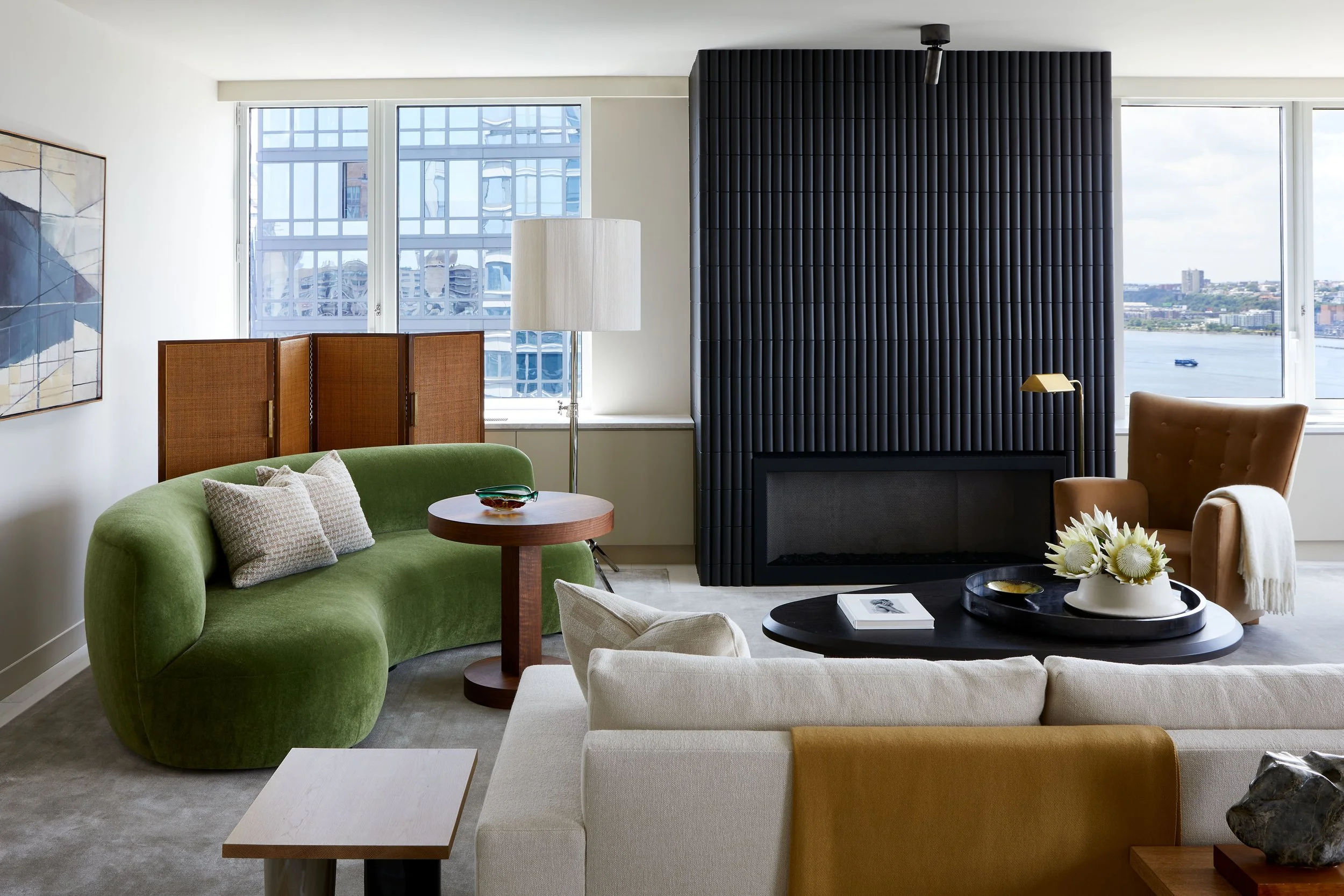 The original living room lacked a focal point, something to anchor the sweeping river views. To give the space weight, we installed a ventless fireplace clad in curved matte-black tiles to gather around. Much of the surrounding seating, including a custom Georg Kofoed-inspired armchair in camel, a curved sofa in green, and an Art Deco armchair in blue, is upholstered in various mohairs and velvets to extend the fire’s warmth.