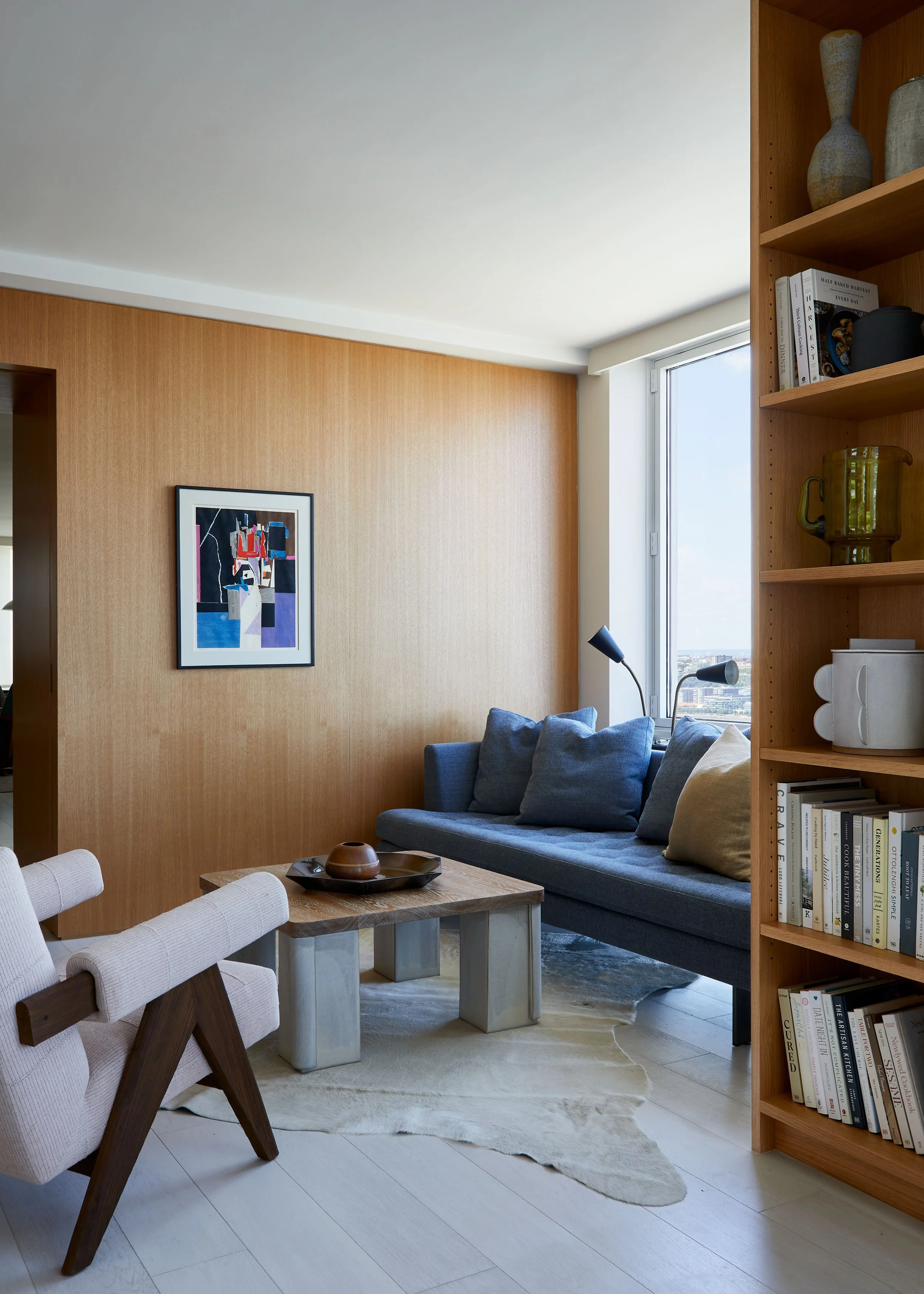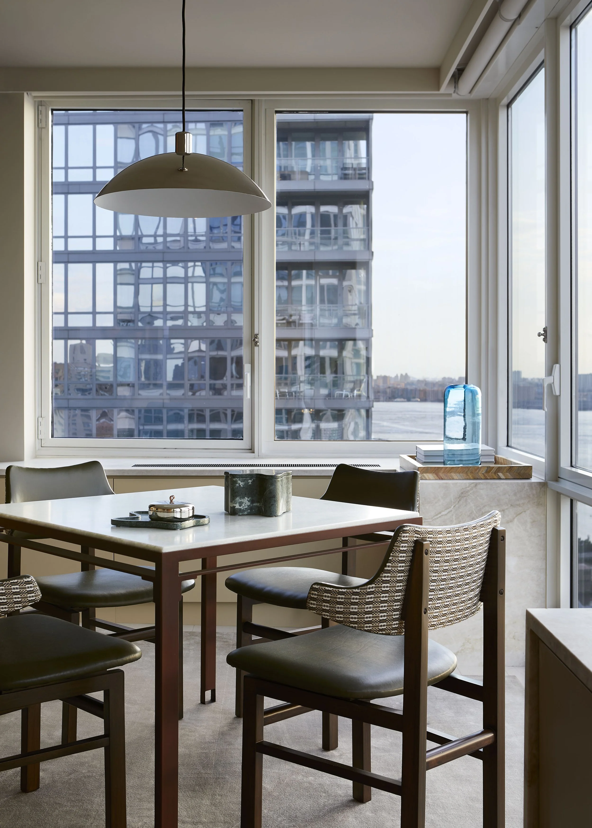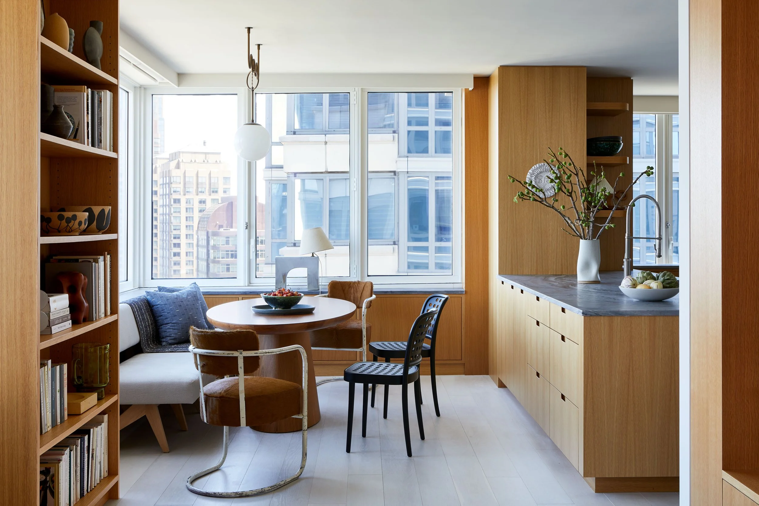 Oak is used in various forms throughout the apartment, both to bring warmth and create cohesion. This includes the white-oiled oak floors and oiled oak paneling. Here, in the breakfast nook, the paneling is built out under the windows to conceal the HVAC system as well as provide the apartment with much-needed storage, a trick that has been employed in each room.