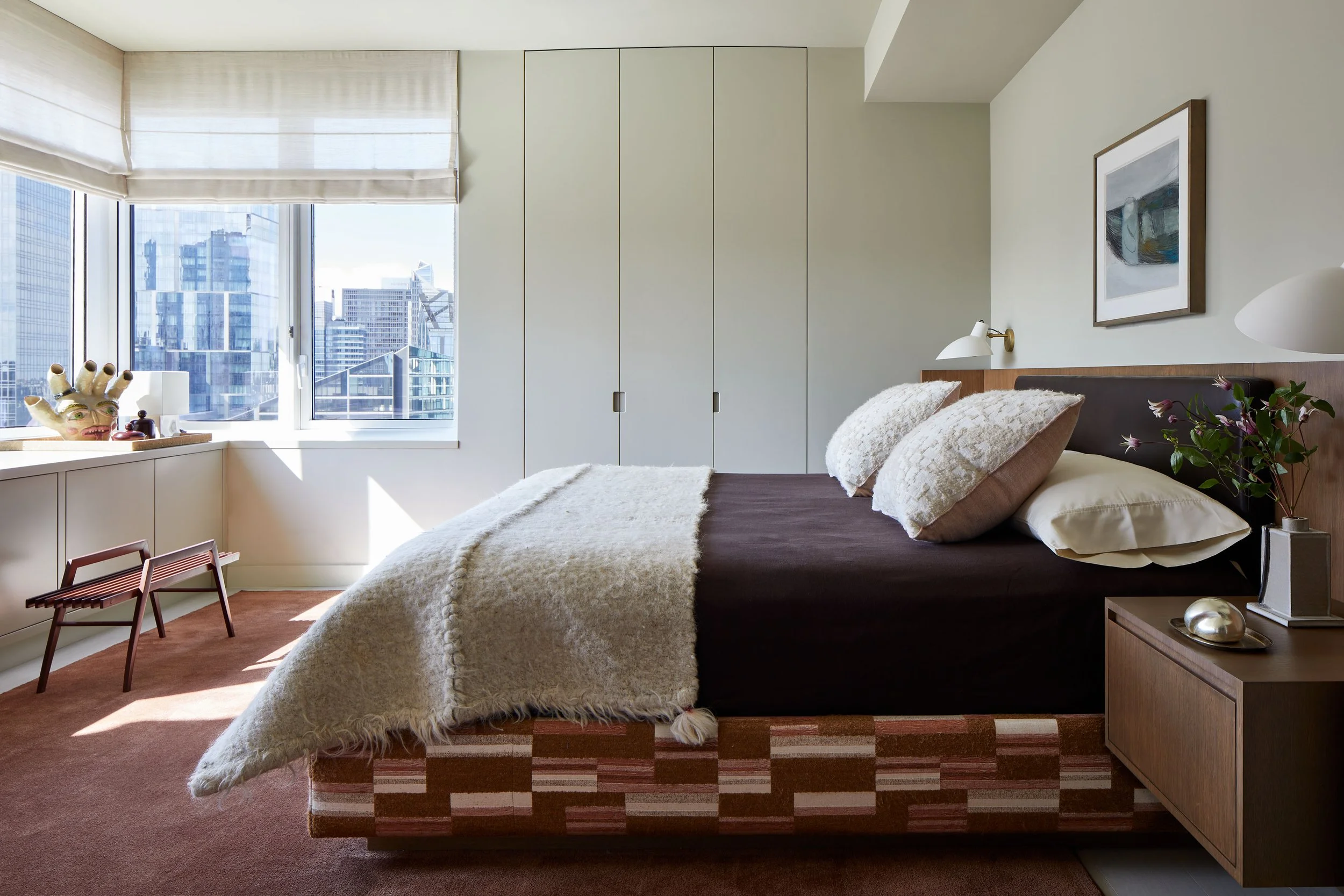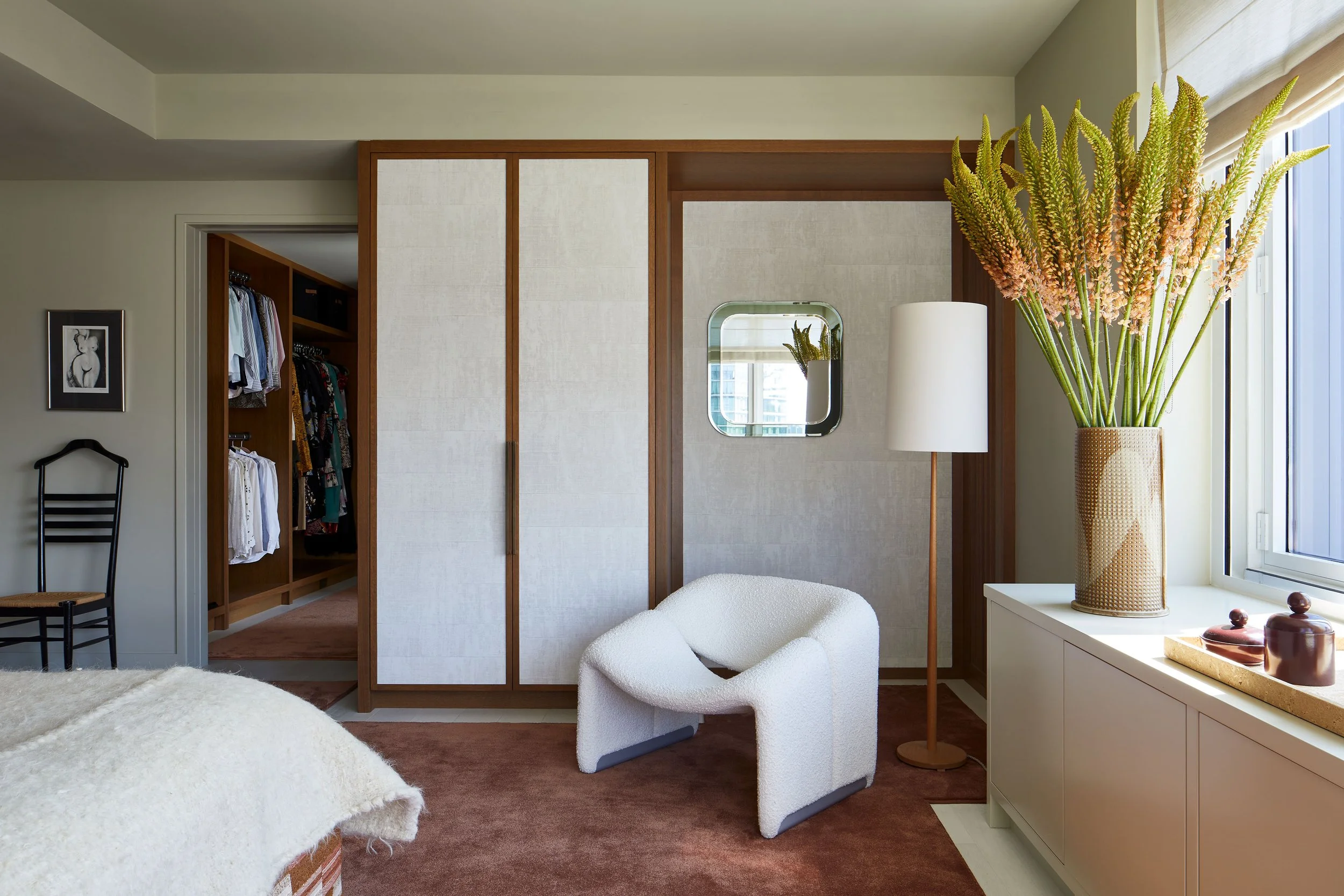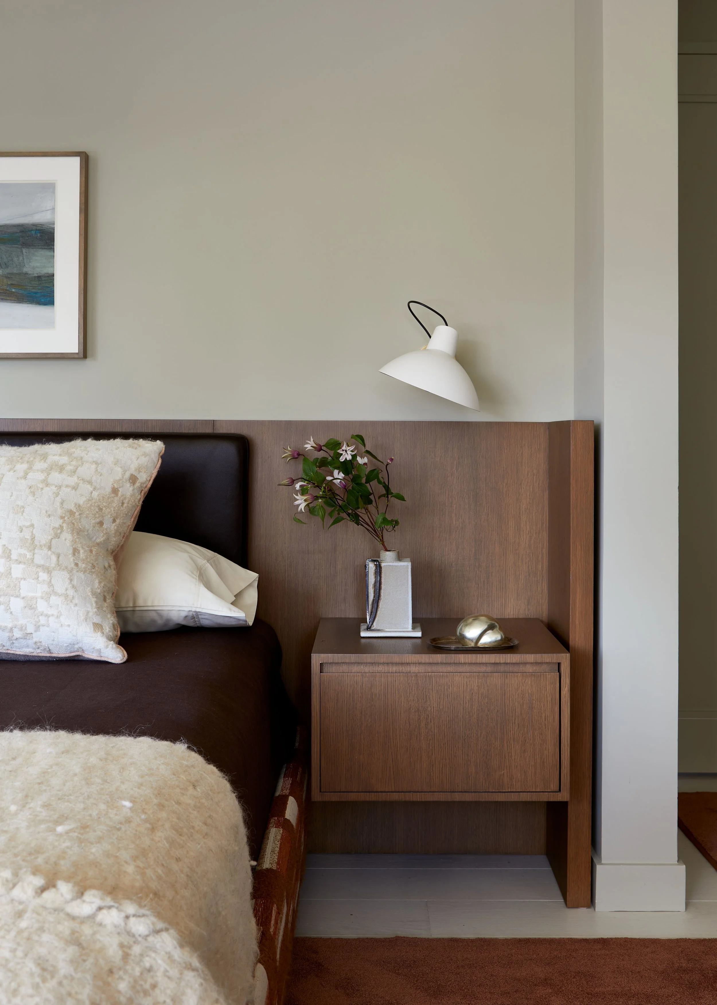 To maximize both the bedroom’s east views and space (it isn’t massive), we wall-mounted as much as possible, including the custom dark-oak-and-leather headboard, the lacquered under window storage, and two wardrobes, one painted to blend in and the other in dark oak and Venetian stucco wallpaper. These hard, angular surfaces are balanced by the texture and shape of other pieces, such as the undulating Groovy Chair by Pierre Paulin in wool boucle and the 70s-inspired patterned wool weave that adorns the bed frame.