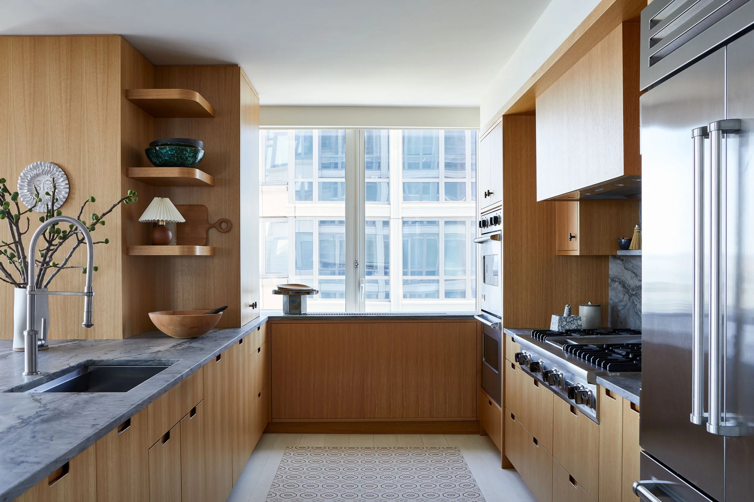 The kitchen is a custom design. Rendered entirely in white oak, it is intended to be a calm, inviting environment for cooking. So, rather than layer additional tones and textures, the remaining details—recessed pulls, stainless steel appliances, and a honed quartzite countertop—were kept as understated as possible.