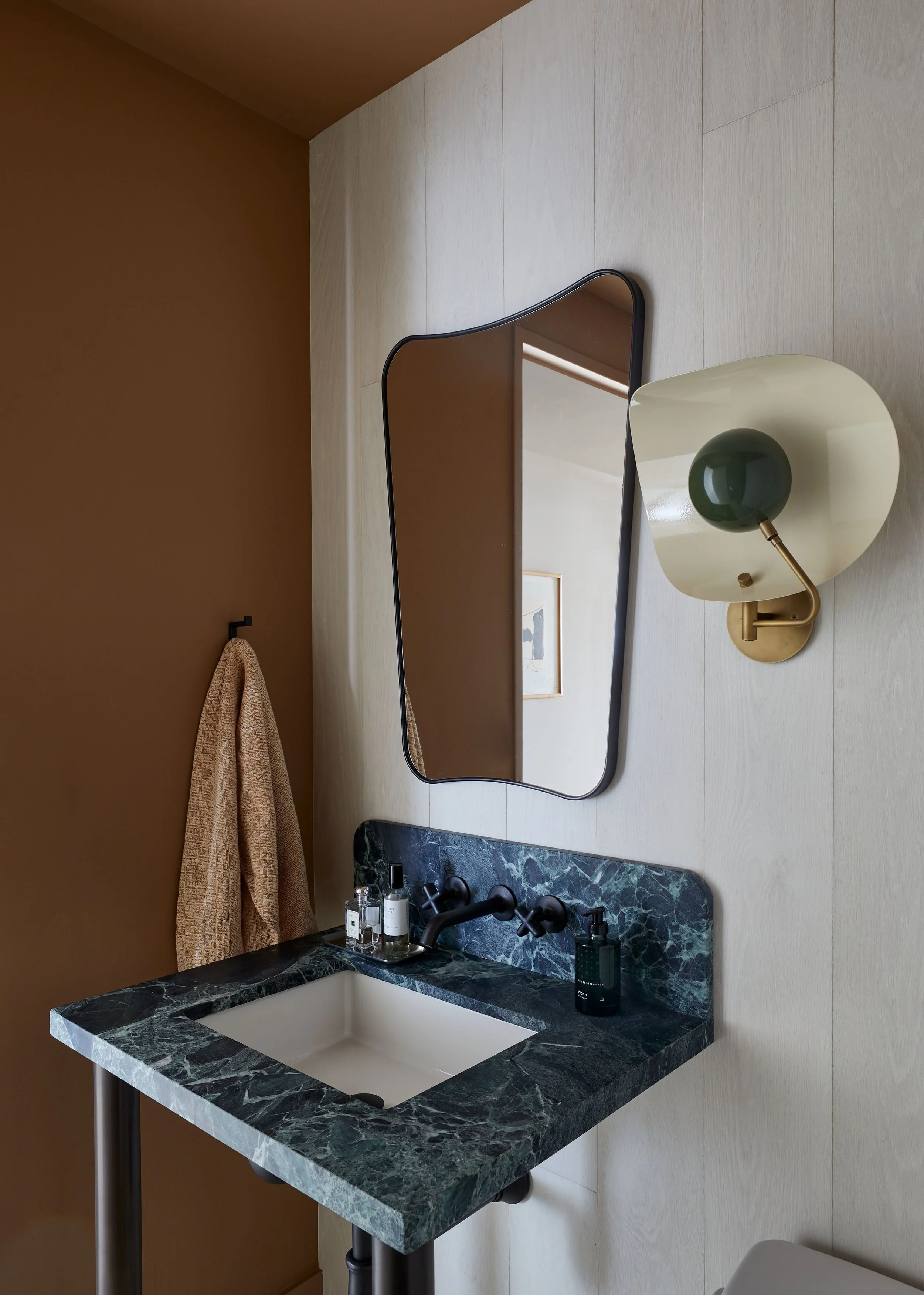 One half of the couple is an avid mahjong player, which meant a games table was a must. While amazing vintage mahjong tables do exist, with their elegantly curved legs and dark, rich tops, their modern iterations, with many technological bells and whistles, didn’t feel quite right for the space. A custom table was commissioned with oxidized bronze legs and a crystalline green marble top
