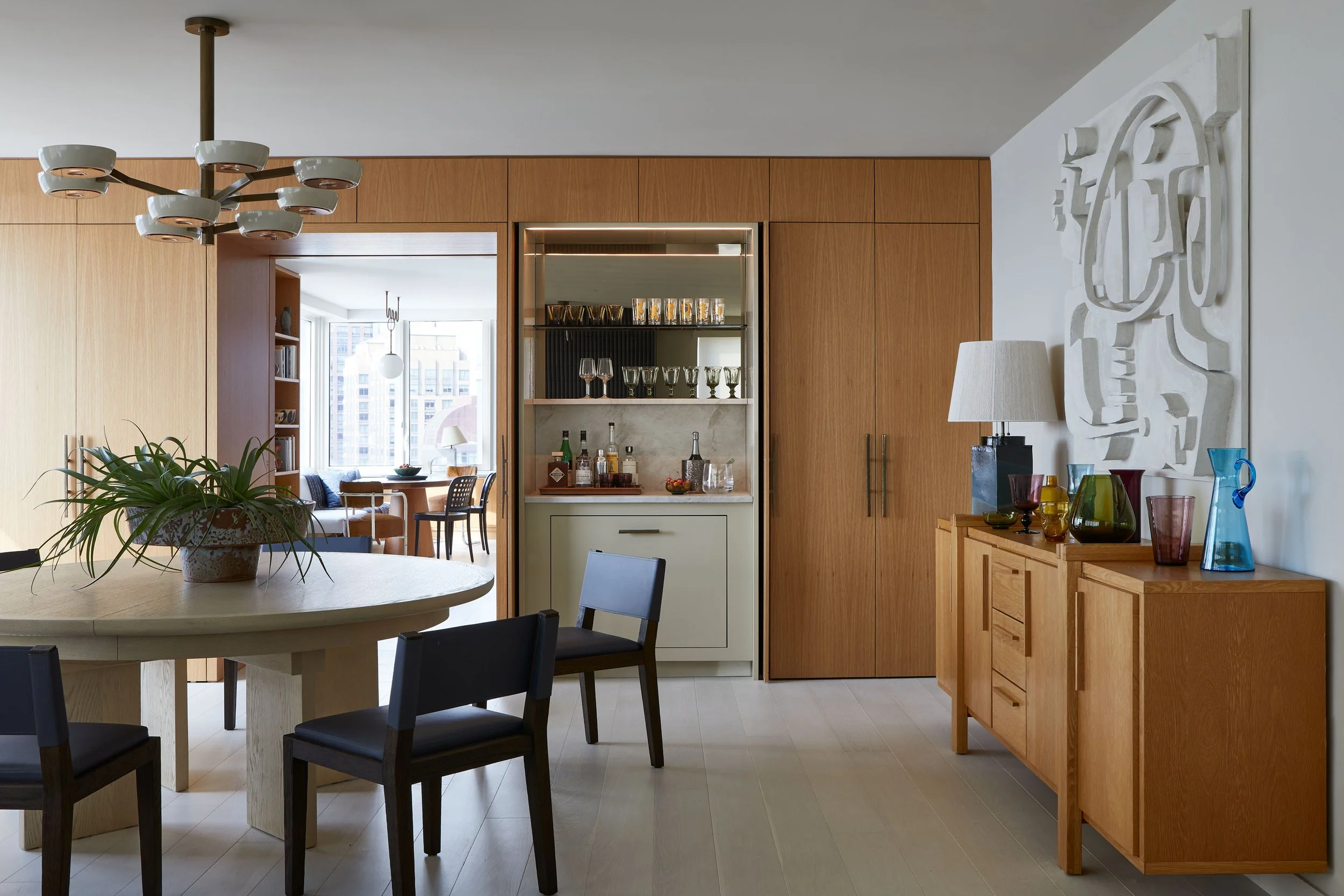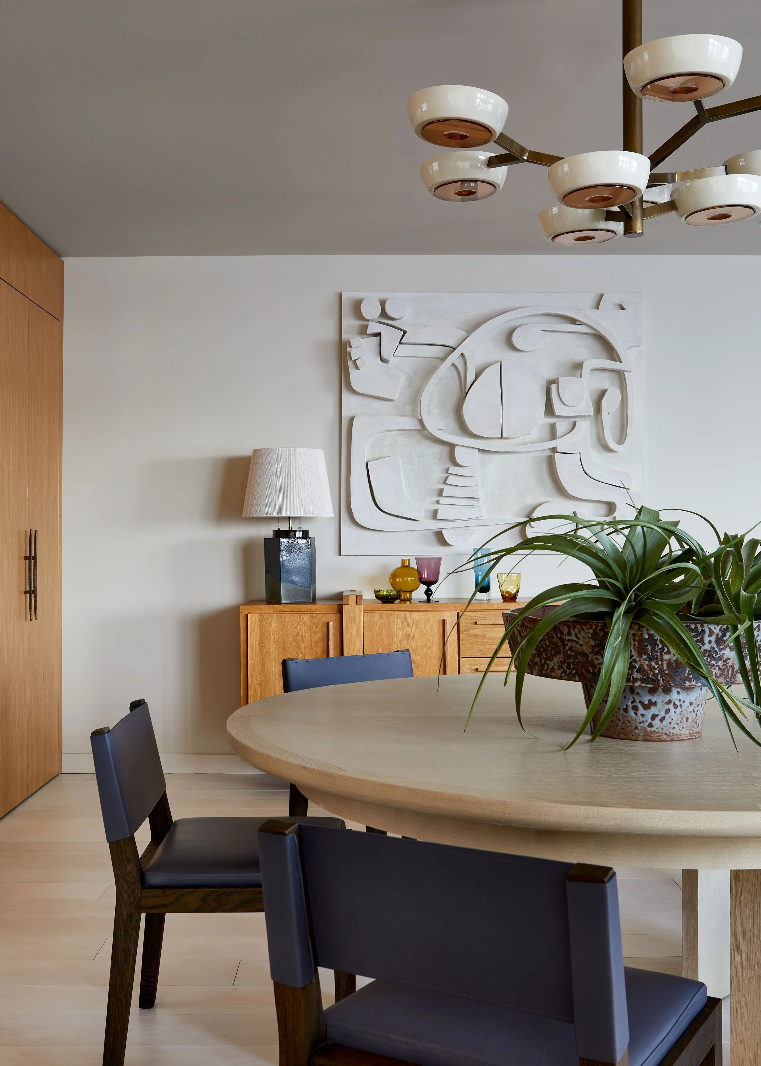 We achieved this through a custom 72-inch round table that can be extended with two leaves. Most of the time, these leaves are concealed in the oiled oak millwork, which also conceal individual cocktail and coffee bars. The paneling’s honeyed tones continue in the vintage Brutalist credenza. Acquired in Belgium, its shapes echo the couple’s artwork.