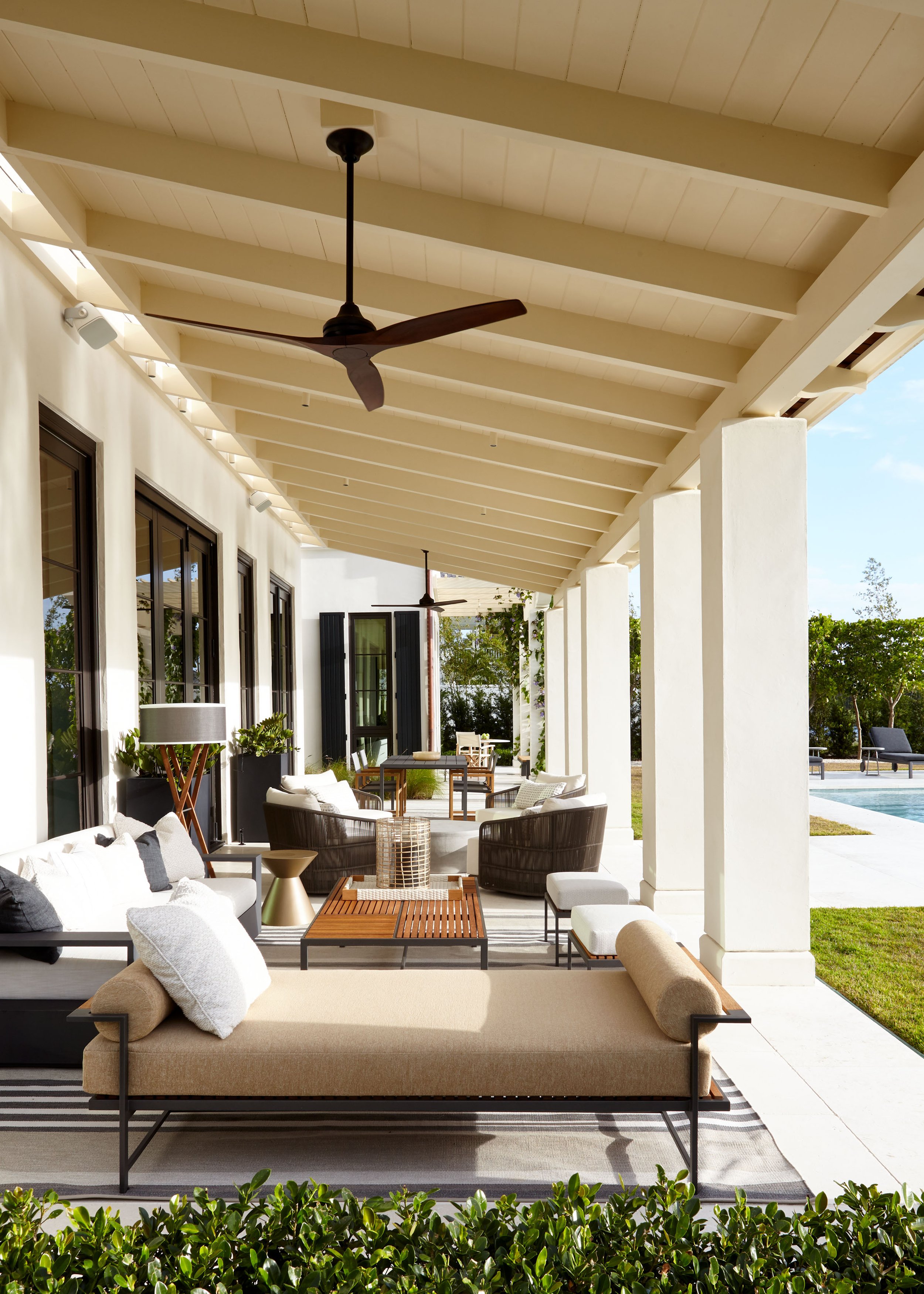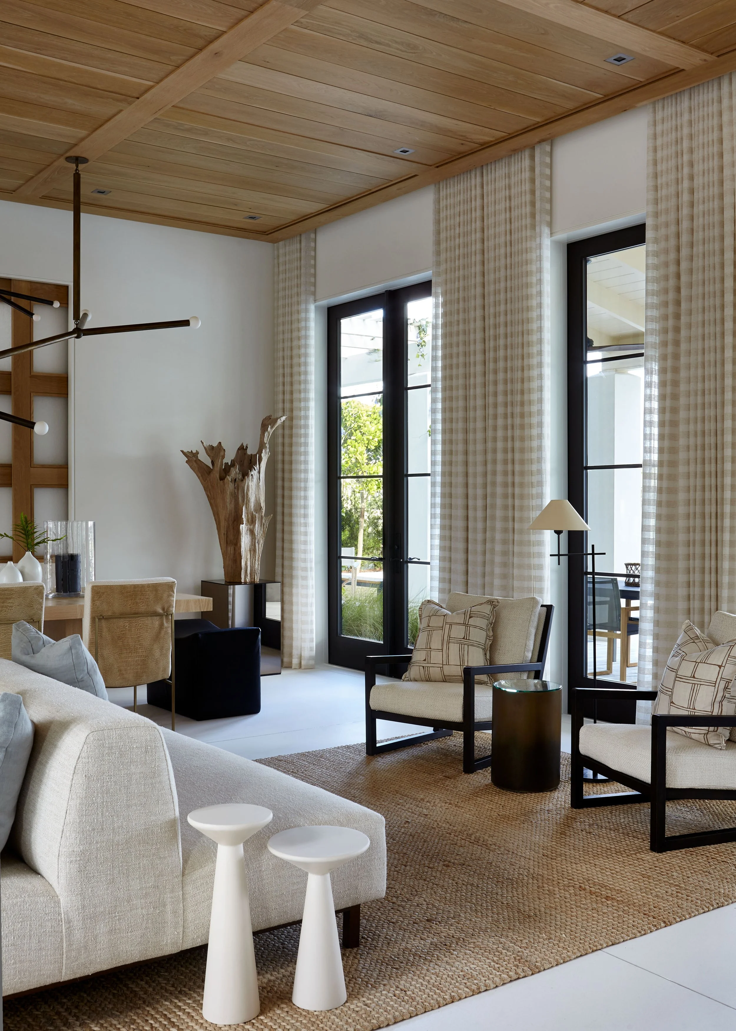 Designed with entertaining in mind, the sizable great room features a mirrored setup of L-shaped sofas and matching coffee tables. The fireplace column is clad in black quartzite, allowing a darkened television screen to recede from view.