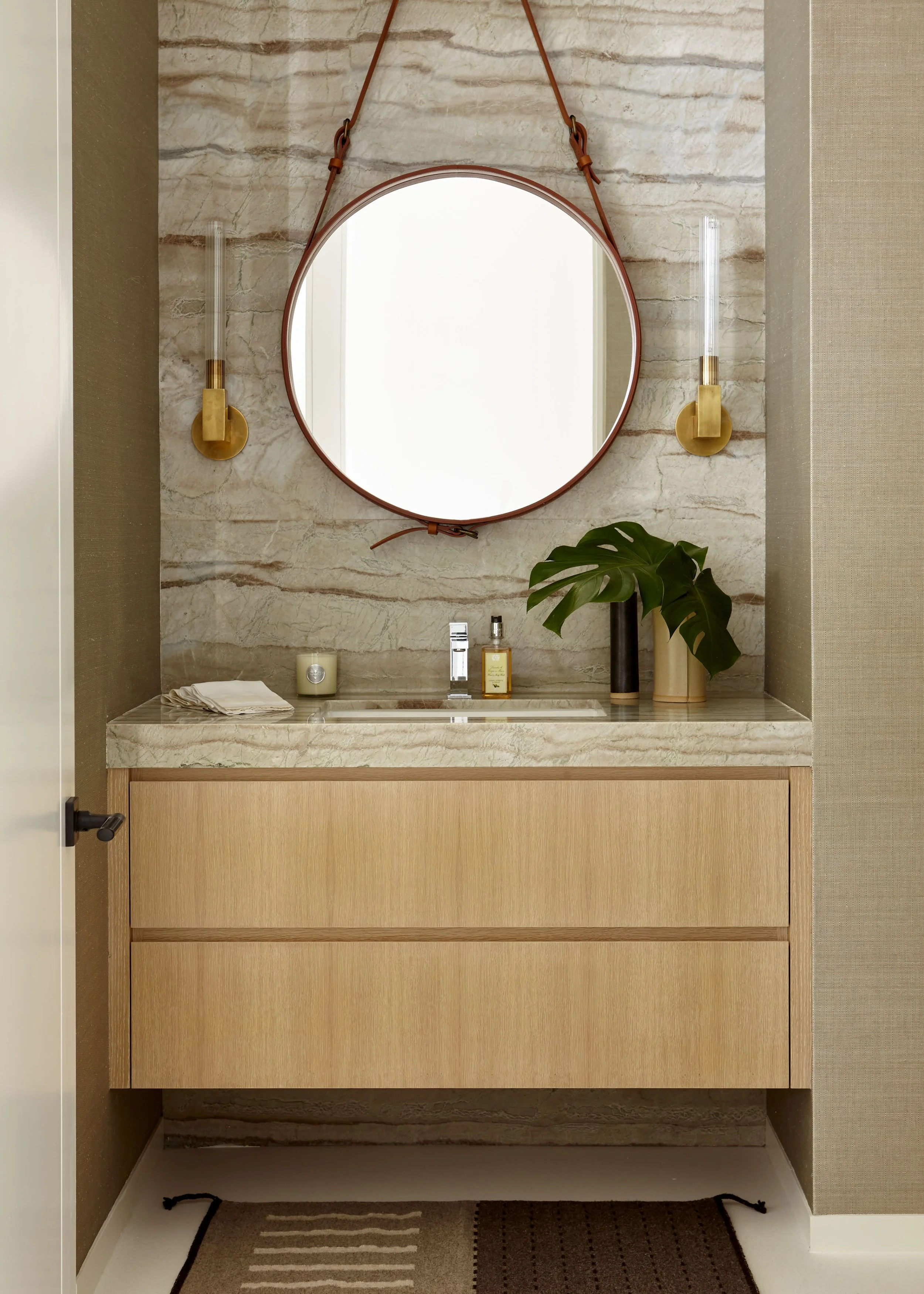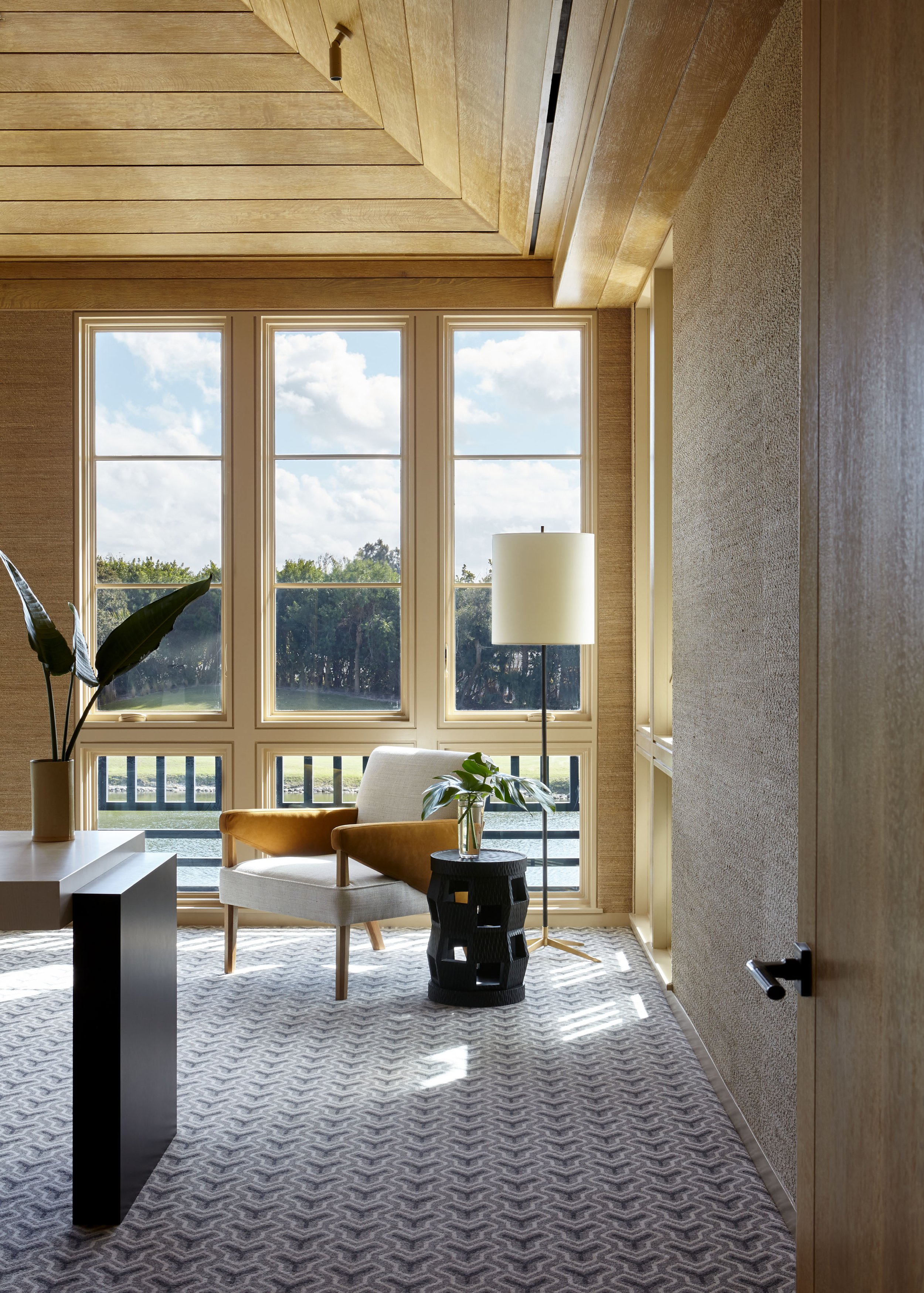 The client’s office is the only place that breaks from the rest of the house’s restrained palette. Here, we sourced a patterned wall-to-wall carpet a la David Hicks, clad the vaulted ceilings in cedar, and covered the walls in seagrass so that the room felt like a hug.