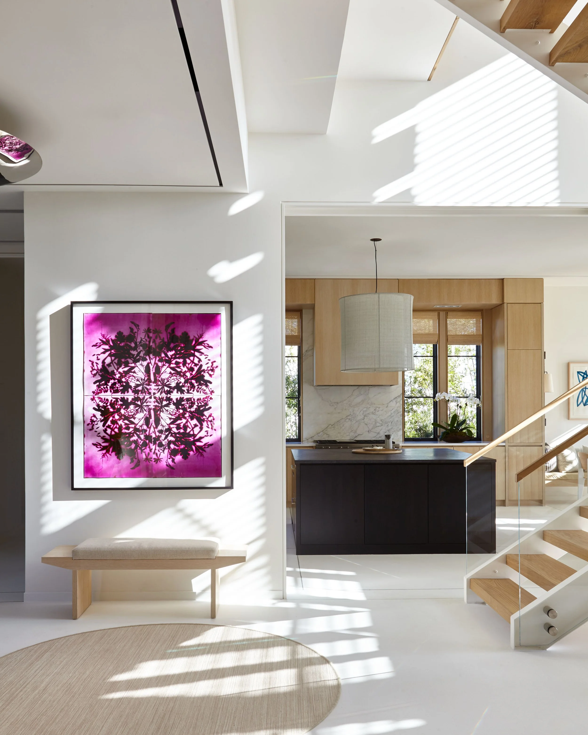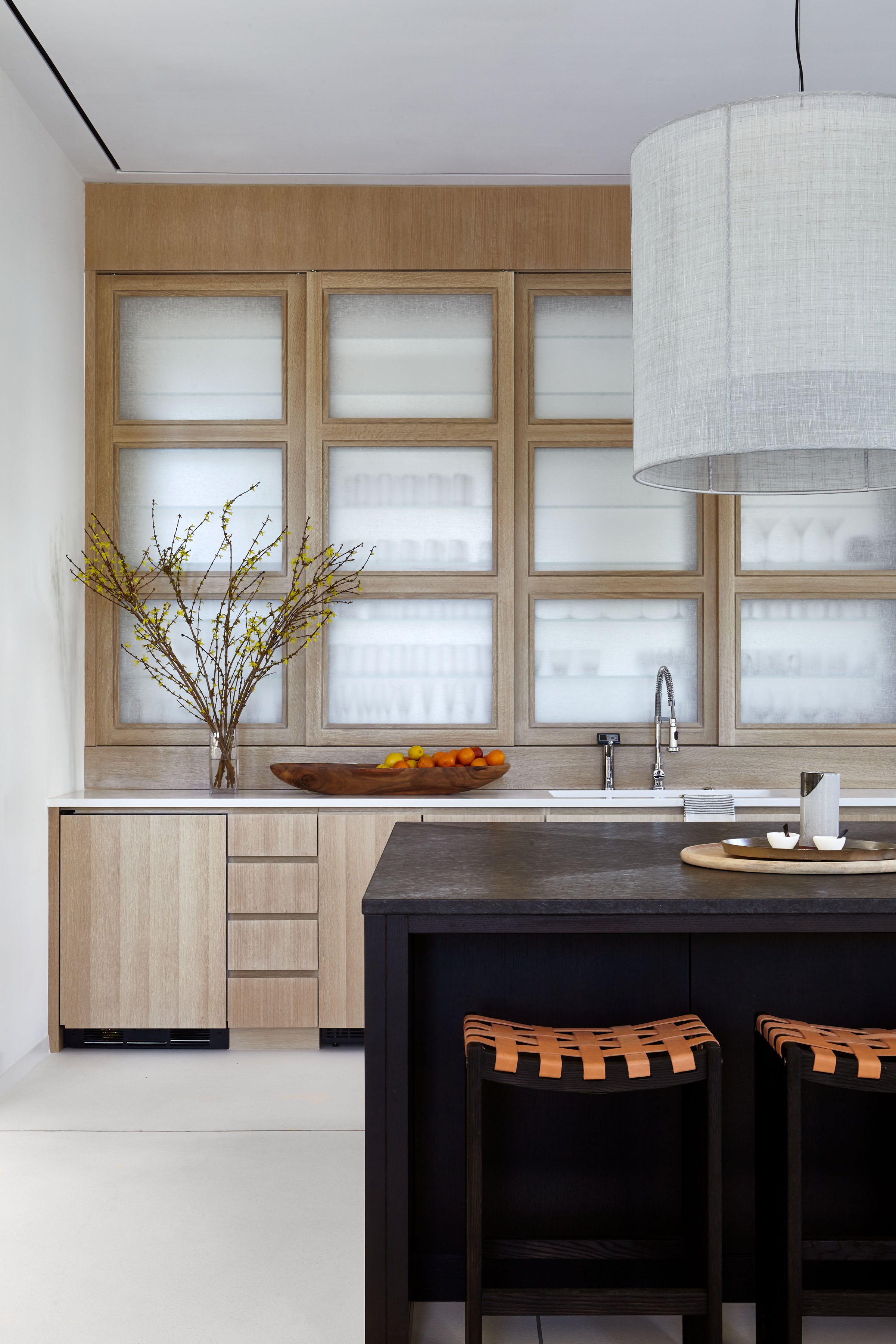 The graphic palette of the living room can also be found in the kitchen, with its cerused white oak cabinets, ebonized black oak island, and white concrete floor. A floating bench upholstered in leather and linen paired with a marble Saarinen tulip table adds softness to the otherwise austere space.