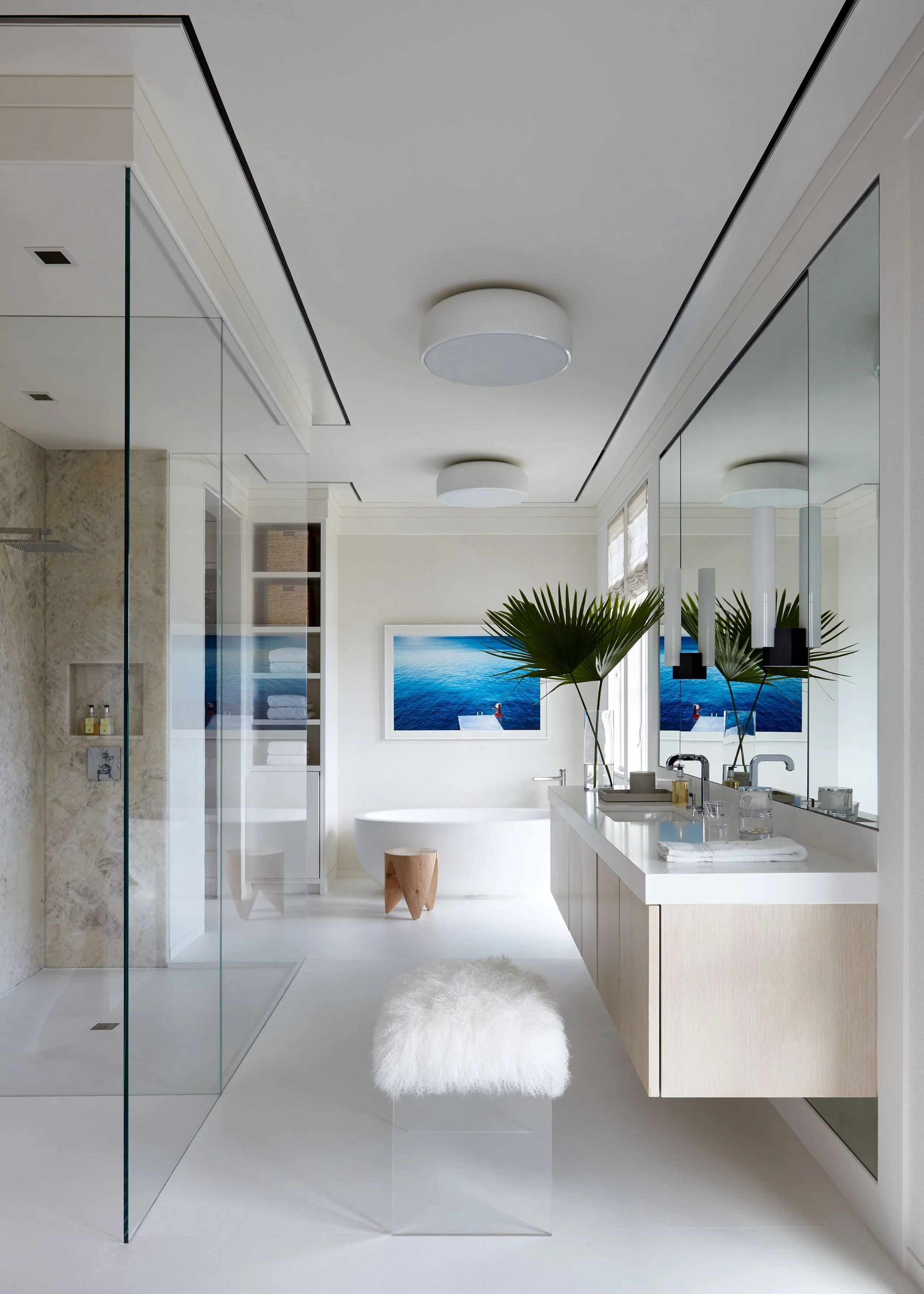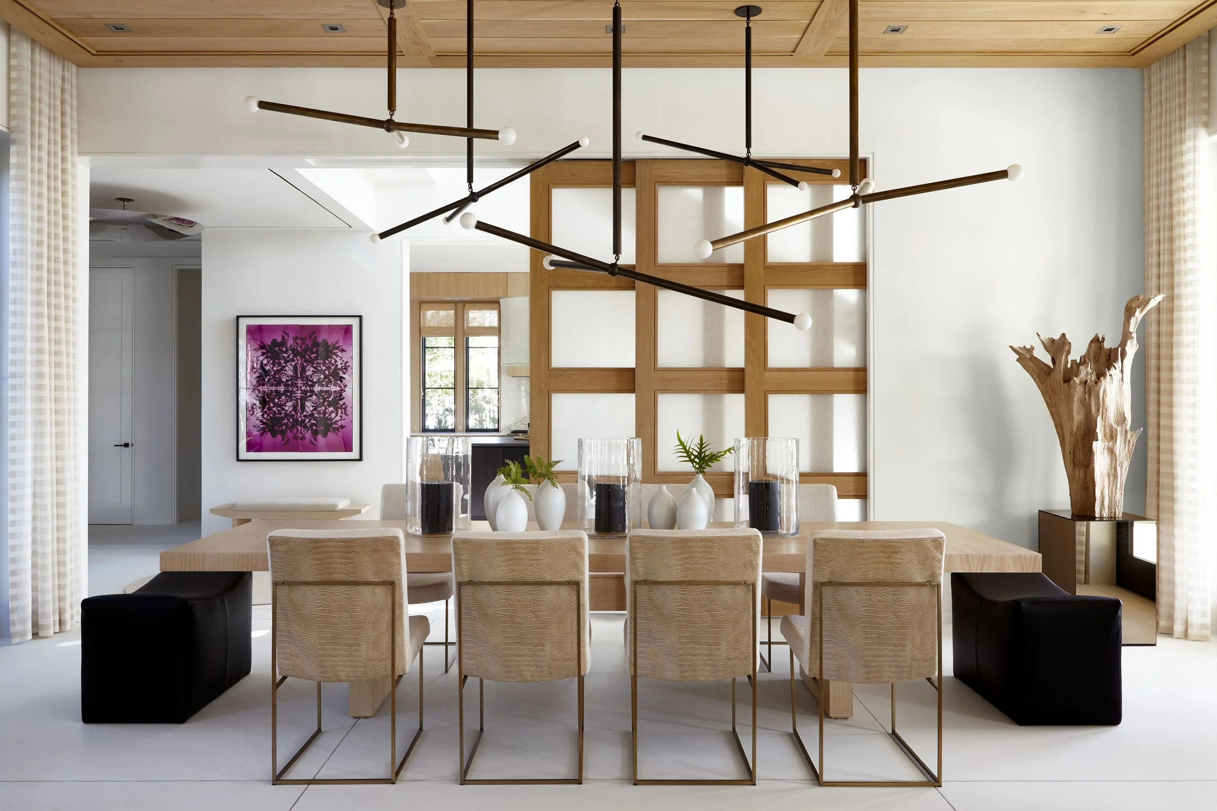 The owners, a couple, who live in the house full-time, and entertain there often, embraced graphic statements and bold gestures in scale. This elevated modern aesthetic unfolds against a high-contrast palette of ivory and camel, with stark ebony accents.